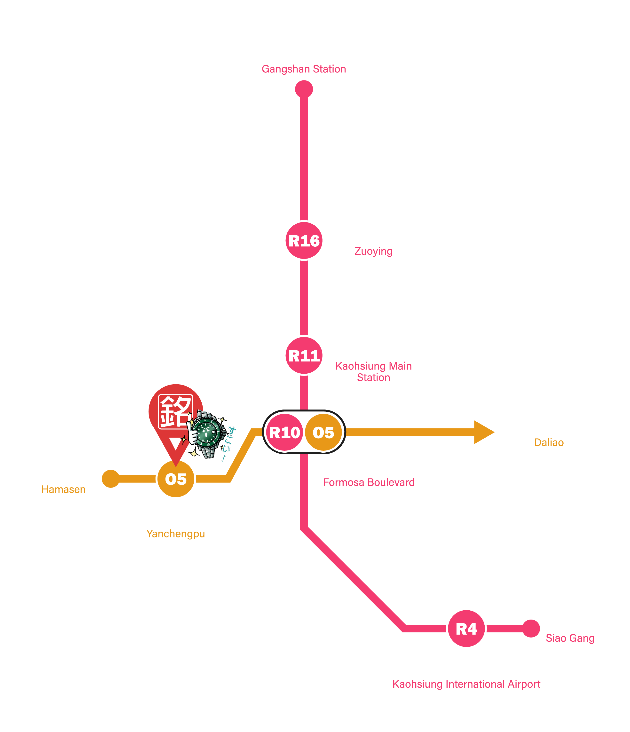 請在高鐵高雄左營站下車,轉乘高雄捷運往小港方向至美麗島站(R10)換乘橘線至鹽埕埔站(O2)下車。