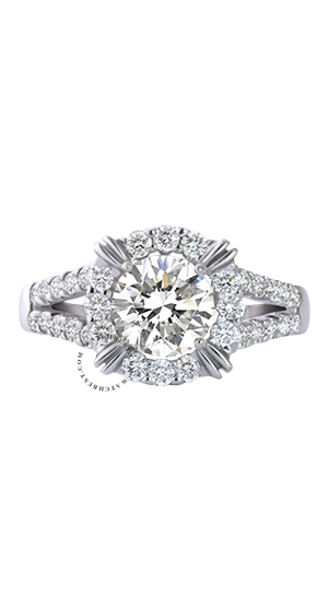 訂婚指環的中央美鑽兩側分別鑲襯圓形美鑽,預示著喜事臨門,佳期將至。以型線分明,充滿現代感的訂婚指環送出佳偶天成的祝福。