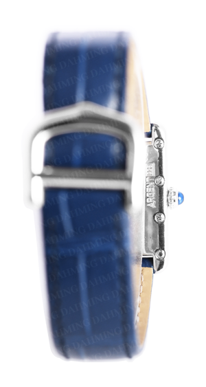 精鋼錶殼,圓珠形錶冠鑲嵌一顆凸圓形藍色合成尖晶石,鍍銀磨砂陽光射線紋飾錶盤,羅馬數字,藍鋼劍形指針,藍寶石水晶鏡面,黑色鱷魚皮錶帶,精鋼針扣式錶扣。錶殼尺寸:46.6毫米x33.9毫米。