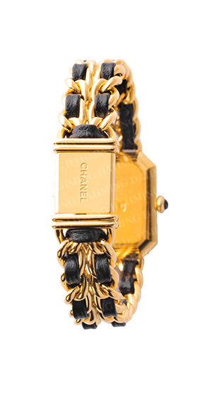 石英機芯請注意:每一至兩年需更換電池。經典Premiere系列,以知名手提包編織紋為靈感。精鋼材質鍍金與皮革。黑色漆面錶盤,鑲嵌凸圓形瑪瑙。適合手圍13~15cm。