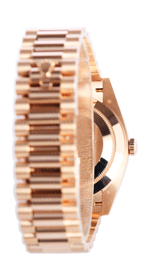 永恆玫瑰金材質,藍寶石水晶玻璃。經典Day-Date系列,星期及日期功能顯示。橄欖綠放射紋錶面,經典總統帶。