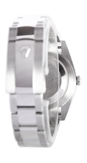 精鋼材質,三角坑紋外圈,日期窗,休閒三版帶,灰色放射紋錶面,時標鑽石。