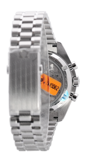 精鋼材質。歐米茄超霸專業「登月錶」配備黑色錶盤,覆蓋抗磨損藍寶石水晶。不鏽鋼錶殼配備設有測速刻度的黑色錶圈。透明錶背可飽覽機芯的運行美態。附獨特的登月錶錶盒。