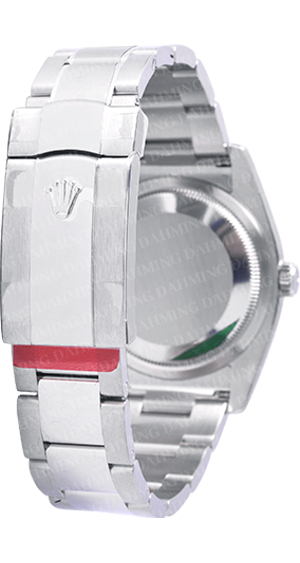 精鋼材質,三角坑紋外圈,日期窗,休閒版帶,黑面條丁錶面。