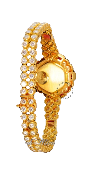 18K黃金材質,金色錶面,錶圈及錶帶皆由頂級白鑽及紅寶石鑲嵌而成。錶徑25*25mm,厚度8.5mm,全長16.8cm。