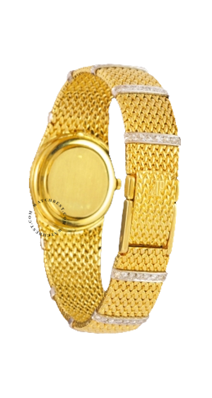 18K黃金與白金雙色金材質,錶帶為精緻的手工編織帶,白K金的部分鑲有頂級白鑽,手上鍊機芯,錶徑23mm*22mm,厚度5mm,全長19cm。