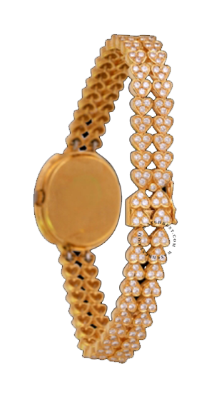 18K黃金材質。橢圓形錶殼,每一鍊都由三顆白鑽鑲成心型。