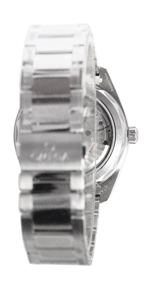 精鋼,可抗15,000高斯。藍色錶盤飾有獨特水平線條「甲板紋」設計,靈感來自豪華遊艇上的木質地板。六點飾有日期窗,指針及時標覆以白色Super-LumiNova超螢光塗層。