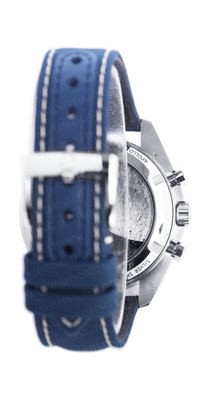 精鋼材質。歐米茄超霸專業「登月錶」配備黑色錶盤,覆蓋抗磨損藍寶石水晶。設有藍色陶瓷錶圈設有鮮明的白