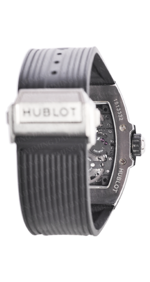 緞面拋光鈦金屬錶殼。微珠噴砂鈦金屬錶圈附6顆H形鈦金屬螺絲。防眩處理藍寶石水晶玻璃。霧面黑色鏤空式錶盤。黑色橡膠錶帶、鈦金屬折疊錶扣。