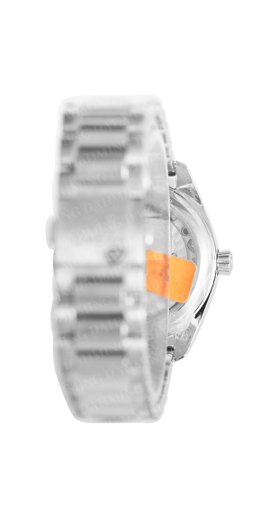 精鋼,可抗15,000高斯。瀉湖綠色太陽放射紋錶盤。六點飾有日期窗。