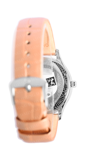 精鋼,兩側以弧線造型各鋪鑲一排鑽石,錶冠採用紅色「Hyceram」拋光並鑲嵌一顆鑽石。白色珍珠母貝錶盤。18K Senda金羅馬數字以及同材質指針。獨特的鏡面錶背飾有「Her Time」圖案。
