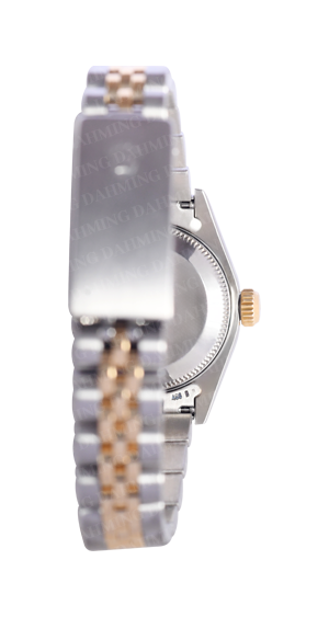 蠔式鋼及18K金,經典五珠錶帶。抗刮損藍水晶,小窗凸透鏡放大日曆。