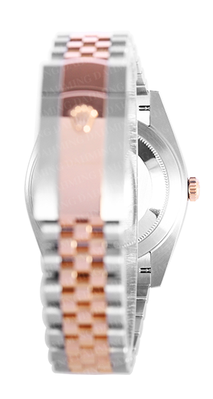 精鋼與18K玫瑰金材質,三角坑紋外圈,日期窗,經典五珠帶,粉面時鑽面盤。