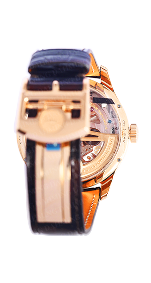 18K玫瑰金材質,藍寶石水晶玻璃。動力儲存顯示,萬年曆搭配日期、星期、月份、四位數數字年分及月相盈虧顯示。