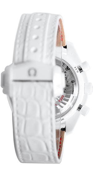 白色陶瓷材質。藍寶石水晶玻璃。月之光面搭配18K白金指針,唯中央秒針採鍍銠拋光設計且具有紅色尖端。