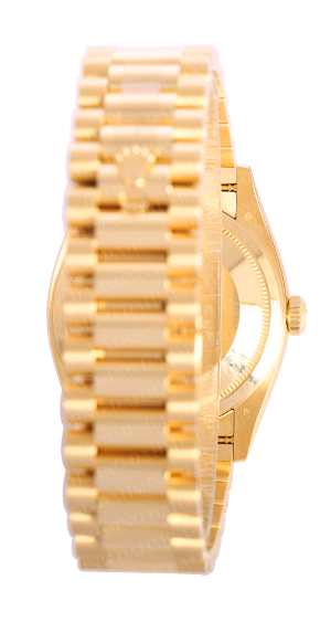 18K黃金材質,18K金立體刻紋圈,星期、日期顯示,白色錶面。元首型總統帶。非常有立體感,高級奢華。