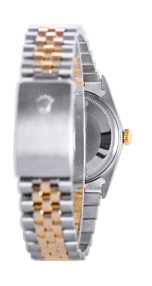 精鋼及18K金材質,膠玻璃。經典Datejust系列,五珠帶。翻寫粉面條丁。