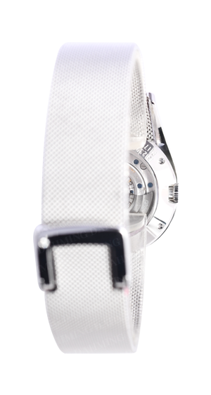 18K白金材質。18K白金錶殼,鑲飾62顆明亮形切割圓形美鑽(約1.64克拉)。藍色砂金石水晶玻璃錶盤。錶扣鑲飾1顆明亮形切割圓形美鑽(約0.01克拉)。300枚限量款式。
