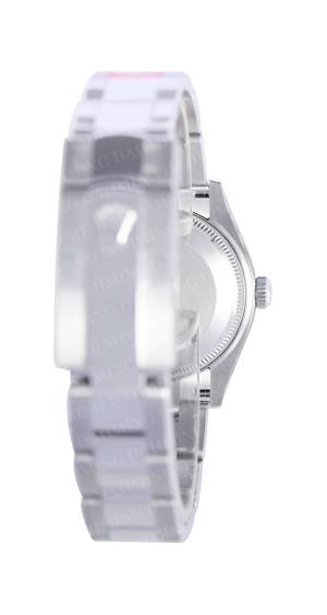 蠔式鋼,休閒版帶。銀白色放射紋面盤。不鏽鋼外圈。抗刮損藍水晶,小窗凸透鏡放大日曆。
