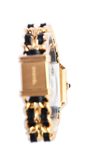 石英機芯請注意:每一至兩年需更換電池。經典Premiere系列,以知名手提包編織紋為靈感。精鋼材質鍍金與皮革。黑色漆面錶盤,鑲嵌凸圓形瑪瑙。
